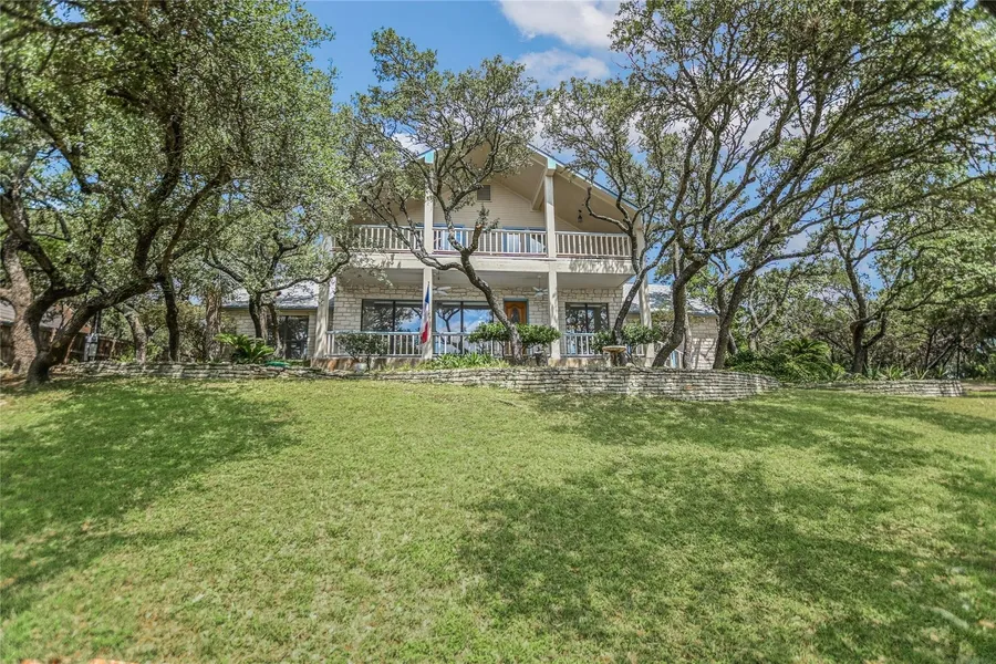 Nestled just minutes from the heart of Wimberley, this beautifully updated home offers the perfect blend of comfort, style, and serene Hill Country living. Boasting an open floor plan with soaring ceilings, this residence is designed for relaxed living and effortless entertaining. The spacious living room features custom built-ins and a striking rock fireplace with propane logs-creating a warm and inviting focal point. The adjoining dining area flows seamlessly into the well-appointed kitchen, which includes sleek quartz countertops, stainless steel appliances, and a cozy breakfast room with beautiful natural light. Step into the sunroom just off the living room-complete with a convenient half bath and enjoy panoramic views from both the upper balcony and the first-floor patio. The generous primary suite is located on the main floor and features his-and-her walk-in closets, a pretty en-s...