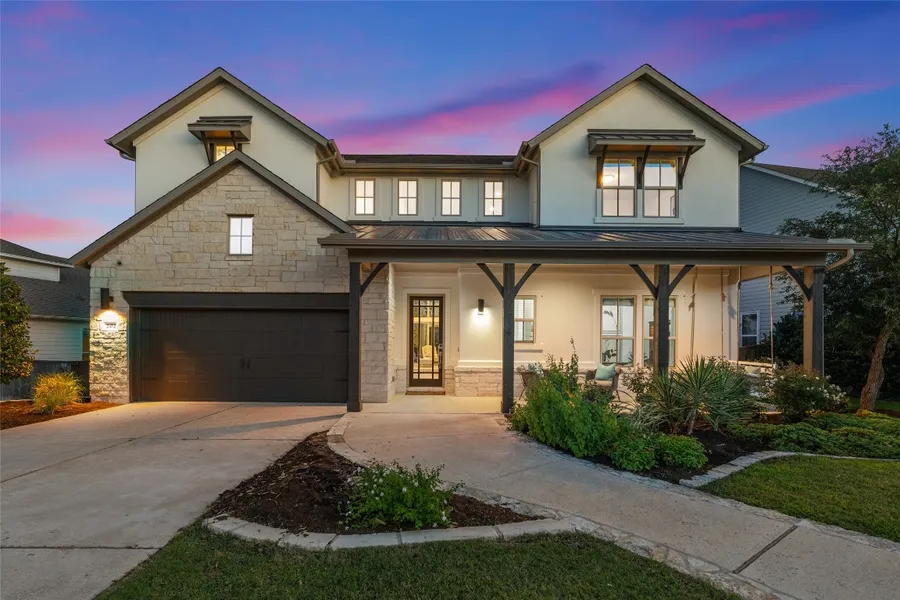 Elegant Farmhouse has freshly painted exterior complemented by a standing seam metal roof covering a large, inviting front porch which sets the tone for this warm and welcoming home. Soaring family room, where high ceilings, a cozy fireplace, warm wood flooring, and floor-to-ceiling glass create a bright space that flows through the open-concept layout. Designed to bring the outdoors in, offering peaceful views and abundant natural light. Private owner's retreat tucked away on the main level, featuring a spa-inspired bath with double vanities, a deep soaking tub, separate shower, and a spaccious walk-in closet. Also on the main level is a handsome study, beautifully accented with a rustic wood barn door-an ideal space for remote work or a quiet reading. The heart of the home is the open-concept kitchen, which boasts soft-painted cabinetry, white Silestone countertops, a stainless-steel a...