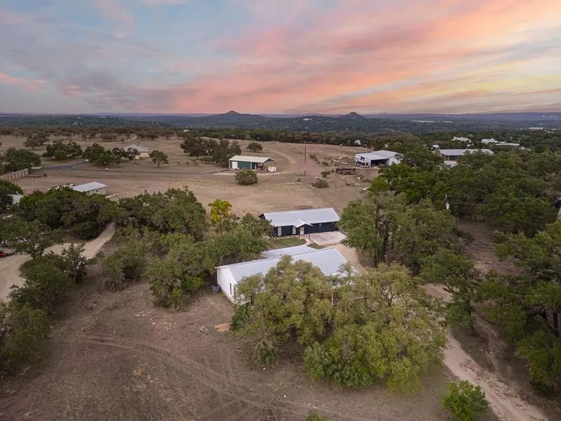 **Front house - 1740 sq ft. Back house - 650 sq ft ** Located on 3 acres only a couple miles from downtown Wimberley, the fully updated main house has 4 bedrooms, 2 full baths, a large living room with vaulted ceilings and cedar accents, a wood burning fireplace, an open concept kitchen and dining area, stainless steel appliances, spacious pantry, ample cabinet space, large walk in closets, and a beautiful outdoor patio. The guest house is a studio apartment with a kitchenette, full bathroom, walk in shower, utility room, and attached garage. Property is fenced and heavily wooded with large heritage live oaks! Both roofs replaced in 2024. All furnishings can be sold with the home for an additional price.