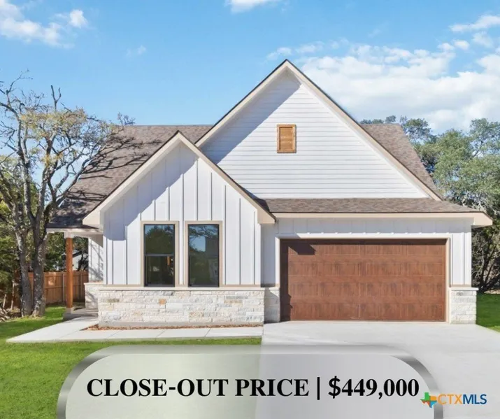 Offered as end-of-year close-out inventory, this completed modern farmhouse is move-in ready and priced to sell. Positioned on an oversized 0.275-acre lot along a quiet cul-de-sac street surrounded by mature oak trees, the home delivers over 2,000 square feet of thoughtfully designed living space with 3 bedrooms, 2.5 bathrooms, and a dedicated office featuring cathedral ceilings-a standout feature rarely found at this price point. The exterior showcases a bold elevated roofline, stone-accented facade, and an inviting covered front porch. Inside, the open-concept layout connects the living, kitchen, and dining areas, highlighted by leathered granite countertops, soft pine cabinetry, and a modern chandelier anchoring the dining space-creating a clean, warm aesthetic suited for both everyday living and entertaining. The primary suite on the main level includes separate vanities, a frameless glass walk-in shower with bench seat and custom tile, a private water closet, and a walk-in closet with custom shelving. Upstairs, two generously sized secondary bedrooms are tucked away for privacy with a full bathroom positioned between them. Outdoor living is extended by a deep covered back patio, ideal for relaxing or hosting gatherings under the oak canopy. Additional functional features include a garage side door providing direct access to the side yard without opening the main garage door. Located in Wimberley, this home offers convenient access to local shops, dining, and community events, with easy proximity to San Marcos, Dripping Springs, Canyon Lake, and Austin-all within approximately 25 minutes. Now complete and available as close-out inventory, this property combines modern design, quality craftsmanship, and an exceptional lot in a sought-after Hill Country setting.