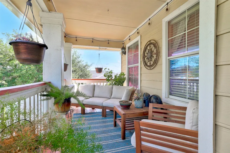 Welcome to Kyle's most sought after Plum Creek neighborhood! Plum Creek offers Tree lined streets, neighborhood parks & playscapes, hike, bike, walking trails, community pools, sport courts, & semi-private Golf course tops the list. Enjoy these many amenities, while living in this amazingly wonderful home, with a large front facing Balcony, access from the Primary Bedroom, cozy up, under the mature Live Oak & Red Oak trees, enjoy the breeze & look out over the neighborhood. 3 spacious bedrooms are upstairs. Primary bedroom, is open & has ample room for king sized bed, primary bath, 2 vanities walk-in shower, garden tub & large, spacious walk-in closet; two other upstairs rooms share a J & J full size bath & all rooms have ceiling fans. Upstairs carpet is brand new. Downstairs has open & inviting floor plan. Custom blonde bamboo floors, inlaid with darker bamboo, to distinguish rooms. A c...