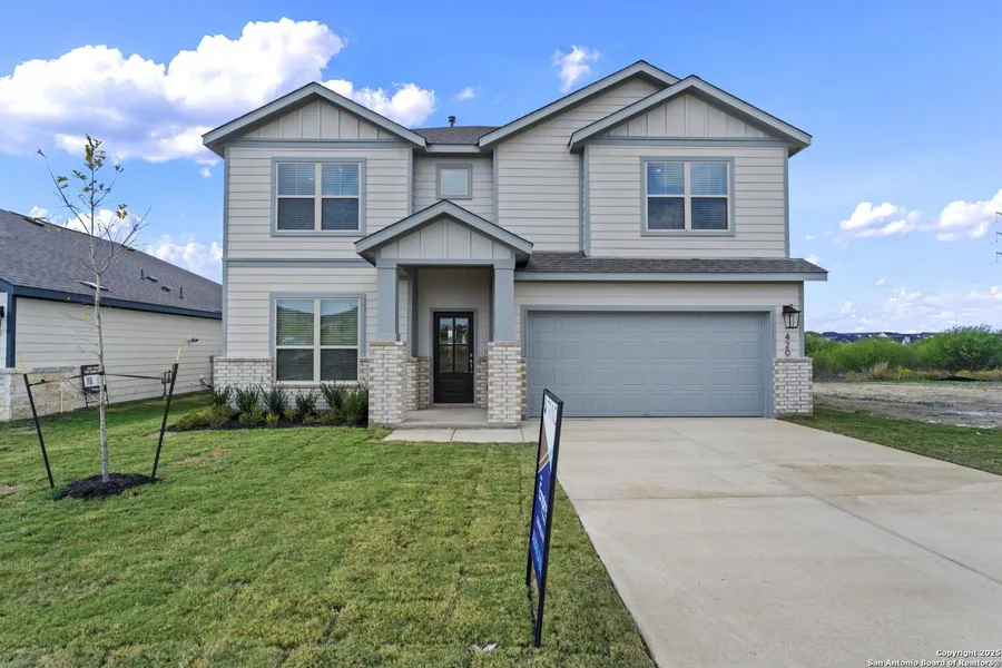 The Windsor A, Homesite 50' is a spacious two-story home offering 3,081 sq. ft. of versatile living space designed for all families. The main floor features a sleek kitchen with a walk-in pantry, a large dining area, and an open living room that leads to a covered patio-ideal for entertaining. A private primary suite is tucked away downstairs with dual vanities, a soaking tub, and a large walk-in closet. Upstairs, a central game room anchors four secondary bedrooms, each with their own walk-in closet for maximum storage. With three full bathrooms, a powder room, and a first-floor flex space perfect for a home office, this layout delivers both comfort and flexibility. A two-car garage, high ceilings, and "open to below" design add an elevated touch to everyday living.