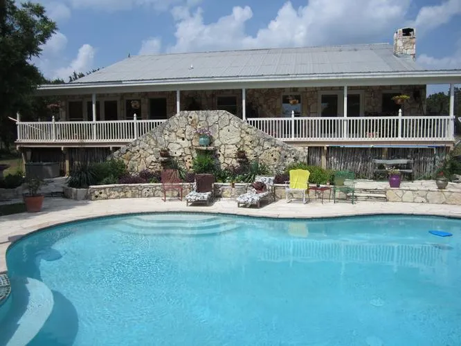 BREATHTAKING BLANCO RIVER FRONTAGE: 197 feet of frontage, 3/2 stone home freshly repainted. Unmatched setting, cypress and pecan lined Blanco Riverfront, gently sloping lawn to river's edge. Large, mature trees, wood burning fireplace, heated pool/hot tub with large deck, soft decorator colors through out. Priced well below very recent estate appraisal!