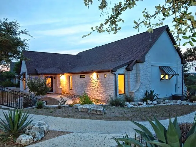LONG DISTANCE HILL COUNTRY VIEWS AND SUNSETS FROM THIS COVERED VERANDA WITH ROCK FIREPLACE. 2008 CUSTOM BUILT 4/3/3 HOME IN PRESTIGIOUS GATED SOUTH RIVER WITH APPROXIMATELY 100 +/- FEET OF BLANCO RIVER FRONTAGE. MAJESTIC CYPRESS TREES AND PRISTINE ACCESS TO THE WATER. GOURMET KITCHEN WITH GRANITE COUNTERTOPS, STAINLESS APPLIANCE PACKAGE INCLUDES A GE MONOGRAM GAS DUAL-FUEL RANGE WITH 6 BURNERS AND A GRIDDLE . KITCHEN ALSO FEATURES A GLASS TILE BACKSPLASH, PANELED ALDERWOOD CUSTON CABINETS, AND A LARGE MULTI-USE BUTLERS PANTRY. THE FLOOR TO CEILING GAS FIREPLACE AND WALL OF PELLA WINDOWS ARE OVERLOOKING THE BEAUTIFUL VIEW WITH SOARING CEILINGS IN THE GREAT ROOM. ENJOY THE PELLA WINDOWS WITH INSET BLINDS AND SOLAR SCREENS. THERE IS POTENTIAL FOR GUEST QUARTERS IN THE 2ND LIVING AREA WITH CONVENIENT FULL BATHROOM AND A KITCHENETTE. THE OUTDOOR LIVING AREA HAS AN EXPANSIVE COVERED PATIO AND OUTDOOR FIREPLACE. WROUGHT IRON FENCING AND XERISCAPE YARD REQUIRES LOW MAINTENANCE. THIS HOME HAS A PRE-PLUMBED BONUS ROOM ABOVE THE DETACHED 3-CAR GARAGE THAT NEEDS MINIMAL FINISH-OUT TO CREATE ADDITIONAL SPACE.