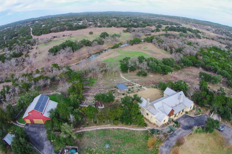 The sprawling, manicured estate has a number of features around every corner. You enter through gate, with 6-ft stone wall flanking the road frontage. To the west of the main home is a traditional barn structure with remodeled 740 sq ft apartment with full kitchen and bath, and 930 sq ft of additional living area ideal for artists studio, plus garage & workshop area. Directly south of the barn area is a fenced-in garden. Looking out to views is an outdoor pavilion and fire pit area. There are also gated pastures and additional outbuildings for storage. This is a really incredible Hill Country setting.