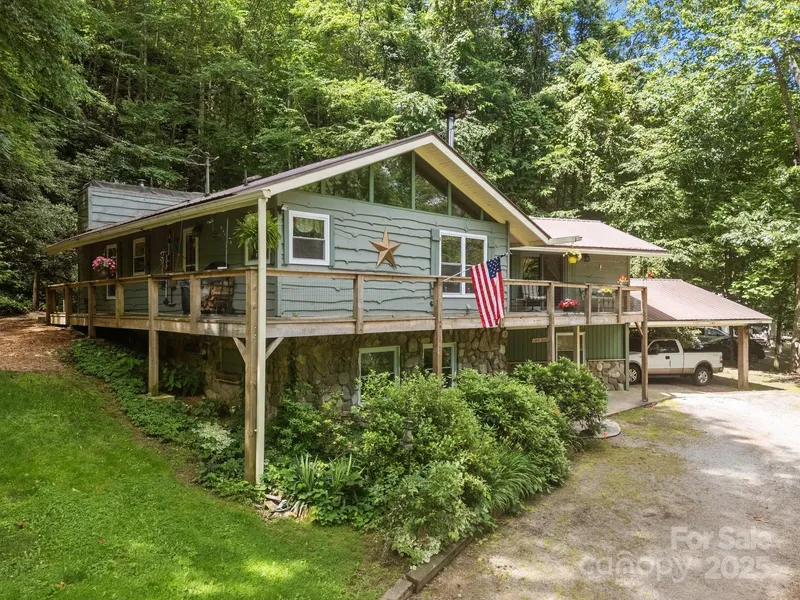 Tucked away on 4.57 acres of serene mountain landscape, this rustic yet refined home offers breathtaking views of the East Fork of the Pigeon River. Ideally located under 10 miles from the Blue Ridge Parkway, 15 minutes from Pisgah National Forest, and only 5 minutes from Springdale Country Club, it provides the perfect balance of seclusion and accessibility. The home's striking wood and stone exterior captures authentic mountain charm, while the interior features soaring vaulted ceilings and expansive windows that fill the space with natural light. The kitchen is a standout, showcasing custom cabinetry handcrafted by the original builder to complement the home's distinctive style. Each bedroom serves as a peaceful retreat with its own private bath. The fully finished basement includes an additional full bathroom and a spacious living area. Outside, enjoy generous deck space for outdoor living, a flat yard ideal for entertaining, and plenty of parking.