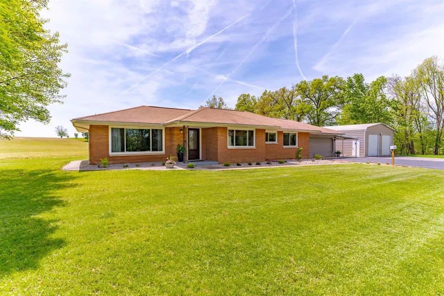 Looking for tranquility and peacefulness in the County, yet still close to the conveniences of town≠ This brick, ranch style home may be for you!! Features include 3 nice size bedrooms, 2 full baths, 2 car attached garage, carport and 2 car detached garage/pole barn with electric that would make a great shop, as well as, a warm and inviting covered patio with a sweet fire pit to gather around and enjoy the view! You will love the all new kitchen with white cabinets, countertops, stainless steel appliances and flooring. You will also find that both baths have been updated nicely with matching wallpaper and shower curtains, new lighting throughout and also beautifully resurfaced hard wood flooring. The Seller has been meticulous in reshaping the yard and adding all new landscaping and rock. There are also newer vinyl replacement windows, hot water heater and a new front door. The unfinished basement provides plenty of storage space or could be finished and used for additional purposes. Seller has also provided a one-year home warranty for peace of mind. This home has it all; sits on 1.26 acres and is not located in the flood zone. Don't wait, call your Realtor today to schedule a showing before this one is gone! Buyer's Agent is responsible for verifying square footage.