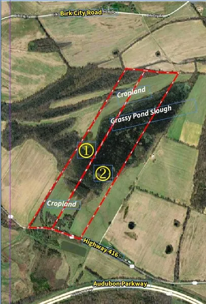 Location: From Exit #10 on the Audubon Parkway east of Henderson, KY take HWY 416 north 2-1/2 miles, then east on HWY 416 at Hebbardsville, four miles to the property.