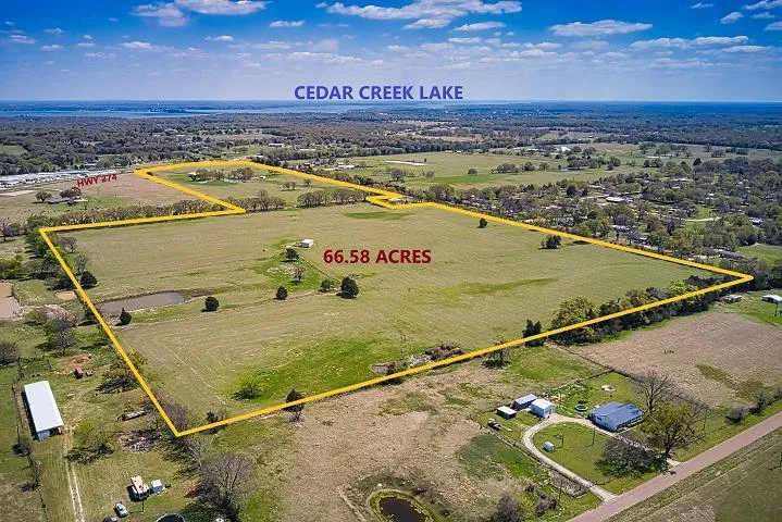 Location, Location, Location this 66+/- acre property is in Henderson County and situated just 2 miles from Cedar Creek Lake. Offering HUGE Road frontage on 3 roads. 410ft. on HWY 274, 430ft. on Flag Lake Road, and 3057ft. on County Road 2100. Offering multiple access points, great for future development or your personal ranch. Power, water meter and septic on property. Currently in AG for hay production with great yield located in the country. Property has improved hay pasture, stock tanks and cattle barn/hay storage. 2nd barn is currently used for hay storage. Access off Hwy 274, with a good road all the way to the property gate. Stone fencing with stone entry gate so all you need is your building plans. Fenced/cross fenced with nice ranches in the area. Multi-parcels 0249.0550.0000.85, 0249.0544.0000.85, 0249.0770.0A00.85. GPS LOCATION 32.3408,-96.2328.