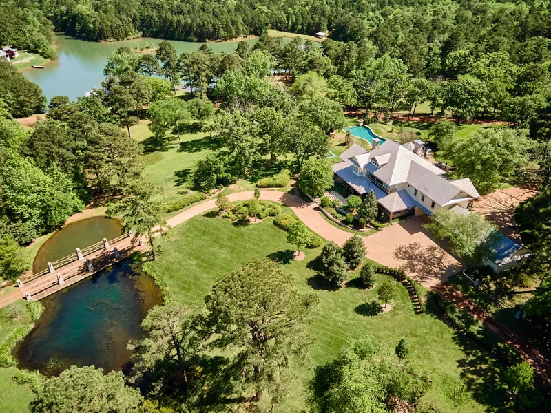 The second floor includes the well-appointed primary suite with adjoining office and reading rooms that boast panoramic views of the rolling lawns, infinity pool and lake. There are four additional spacious bedrooms on this level, each named for their unique decor, and including en-suite bathrooms. The lower level is an entertainment area for all ages, and opens to the large infinity pool and in-ground trampoline overlooking the lake. Cedar trees harvested from the property were used to construct the outdoor porches and several bridges near the house.