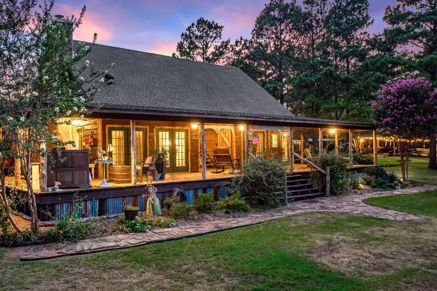 Unique 2006 custom built milled cedar home captures the essence of the classic settlers or dogtrot house. Vintage repurposed barn doors & reclaimed barn tin gives the house an old fashioned charm. Two bedrooms, two baths, a dogtrot & an open planned kitchen-living area gives a total of 1797 sqft living space. As you make your way through pine and hardwoods, youre greeted by a vision of an era gone by. This home is accessed by a 12x60 covered wrap around porch with six sets of French doors. When all the doors are opened the dogtrot breezeway pulls fresh air right down the middle of the house. Enclose the dog trot by securing two repurposed barn doors at both ends & make this room functional for all seasons. Fashioned after Sam Houstons home in Huntsville, the loft room is accessed by stairs in the dog trot. Open planned kitchen-living room, with 30 vaulted ceiling adds a sense of spaciousness. Highlights of this space are a restored vintage chamber range, hidden appliances, black honed granite counter space, copper farmhouse sink. Attached is a full bath, w-subway tiled walls & vintage hexagon ceramic tiled floor. Bathroom is conveniently entered through the living area or the porch making for a quick in-out! The loft room is visible from this space. The bedroom is designed with whitewashed shiplap walls and WBFP giving a dramatic ambiance on cold winter days. The ensuite bathroom has a vintage clawfoot tub centered mid-room. The laundry & closet are adjacent. A custom-made conversation pavilion & outdoor dining area consisting of a 5-burner stove top, Traeger grill & bar sink joins the lit 50 guest dining area & chandelier lit bar. Also, on the property is a fire pit w-bench seating surrounded by outdoor string lights & a second more rustic, torch lit fire pit & repurposed log seating. There is also a charming garden gazebo with benches and lovely blooming flowers. This could make for an incredible wedding venue or Airbnb and may be sold with furnishings for an acceptable offer.