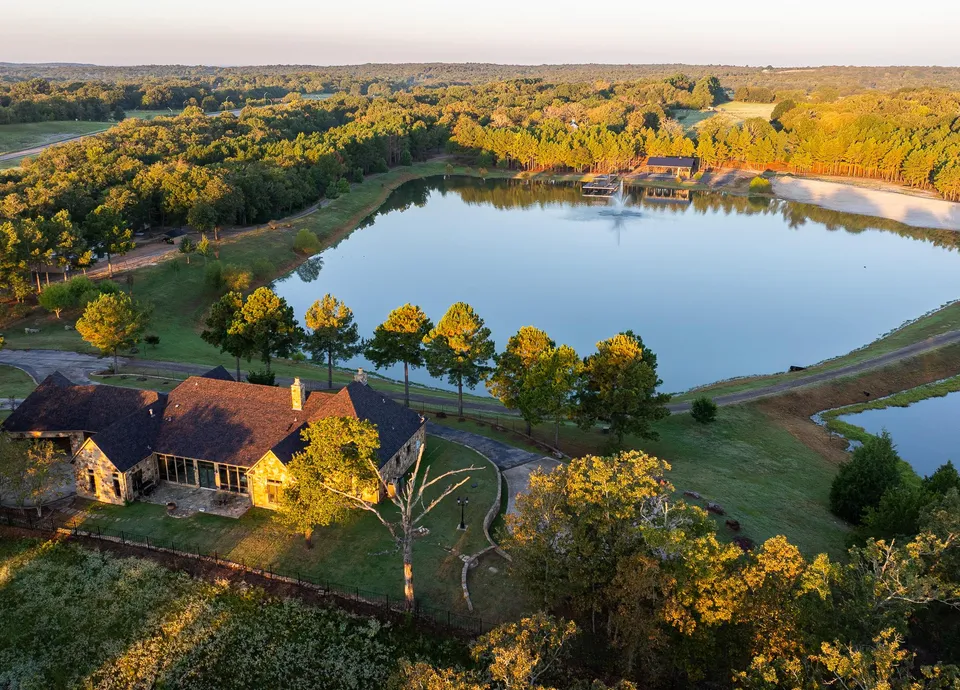The land itself is a showcase of East Texas beauty. Anchoring the property is a reservoir-style lake of approximately 10 acres, bordered by stone walls, a white sand beach, a boat ramp, and an elegant fountain. This lake, along with four additional ponds, provides outstanding recreational appeal, from fishing to paddle sports to simply enjoying the tranquil water views. Mature hardwood timber dominates much of the landscape, with a clear, well-maintained understory that creates a park-like setting. Winding drives meander through the trees and across water features, offering a majestic arrival experience to both the primary residence and event venue.