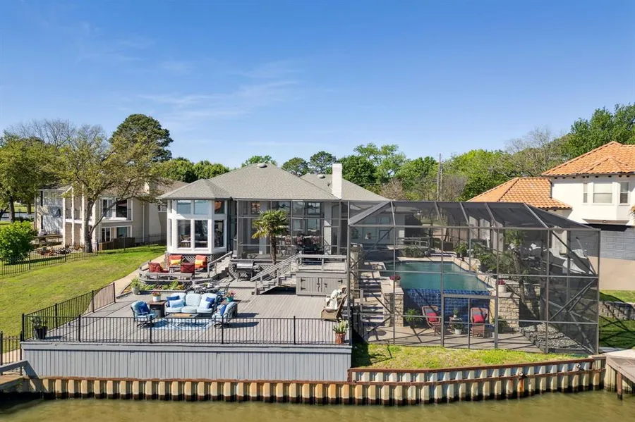This iconic home stands as a cherished sanctuary with unobstructed views of the expansive open water perfectly positioned on a vast private point on Cedar Creek Lake. With brilliant design, it showcases a multitude of impressive features, such as 3 bedrooms with the primary enjoying water views, 2 full baths and a half bath providing access from the pool, expansive windows many with electric shades, a cozy fireplace with beautiful built-ins, a gorgeous upscale kitchen with double ovens, warming drawer,ice maker,trash compactor,drawer microwave,built-in frig, and breakfast bar,plus neutral finishes throughout.However, It is the out door amenities that you will get full lake enjoyment. These include a unique infinity-style pool and spa with a lanai enclosure,multiple sprawling deck areas,outdoor wet bar with beverage cooler,lush landscaping, endless open water views, and an exceptional boathouse facility crowned with an oversized party deck.