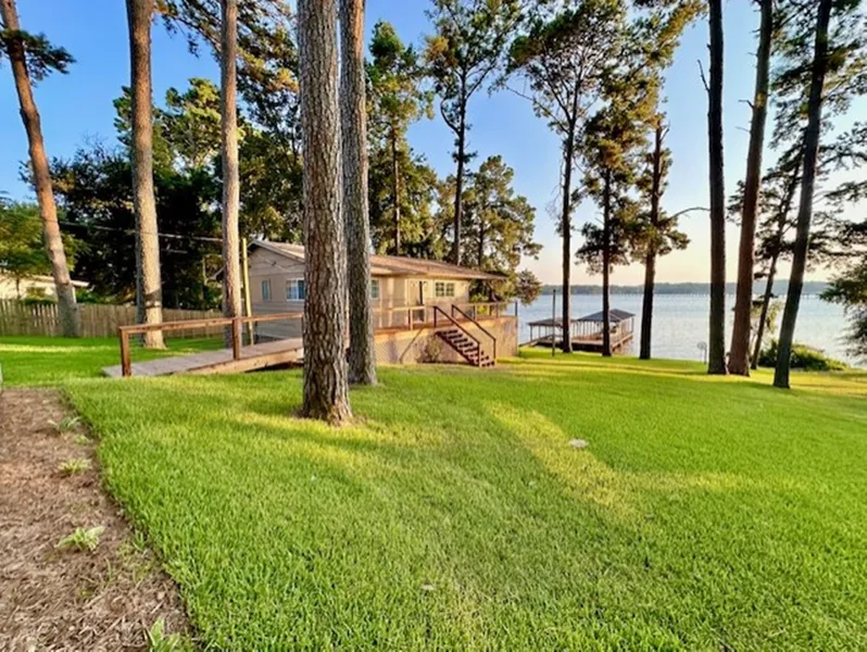 Escape to this beautifully updated two bedroom one bath waterfront cottage nestled on 1 full acre with gorgeous mature trees! Here you have an impressive 162' of shoreline with your own sandy beach on Lake Palestine. Enjoy breathtaking open water views from the comfort of your open concept living space with a vaulted beamed ceiling, a wall of French doors and low maintenance vinyl plank wood look flooring. Two comfortable bedrooms share a spa like bath. The utility closet comes with stackable/washer and dryer. There's a brand new electric heat and ac unit and a brand new on-demand hot water heater. The kitchen with all appliances staying provides fabulous views of the lake and the spacious fenced yard. This all seamlessly extends to a new covered deck, stylish new railing and new stairs to provide additional protected outdoor living space while watching amazing sunsets. The detached 20x30' metal shop/garage has a 12' electric door with remote opener for trailer or water toy storage plus there is extensive storage under the deck. The home and shop sit on lots 2 & 3 which are watered by sprinkler from the lake. For those who love the lake life, this property features two boathouses! One with an electric boat lift and the other with an electric lift for jet skis with covered space for more outdoor living space catching the breezes and open decking for sunbathing or fishing. There is the option to build an additional home on Lot 1. If you are seeking a private getaway or wanting to downsize to full time life at the lake, don't miss this rare lakeside gem! Schedule your showing today.
