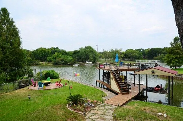 LITTLE SWIMMERS? Ideal south facing cove location with gorgeous views, weather protected & no wake zone. Swim & play just off your boathouse! 3/2 with open living, kitchen & dining area. Master suite with wall of windows opening to water views. Elevated rear deck ideal for outdoor living & entertaining. Fantastic boathouse with party deck, boat lift & 4 PWC lifts. Sandy bottom in swim area great for kids of all ages! Attractive landscaping & flagstone walkways. Yard fully sprinklered & fenced along sides. Well maintained home ready for your lake enjoyment. Inquiry Code: 85870