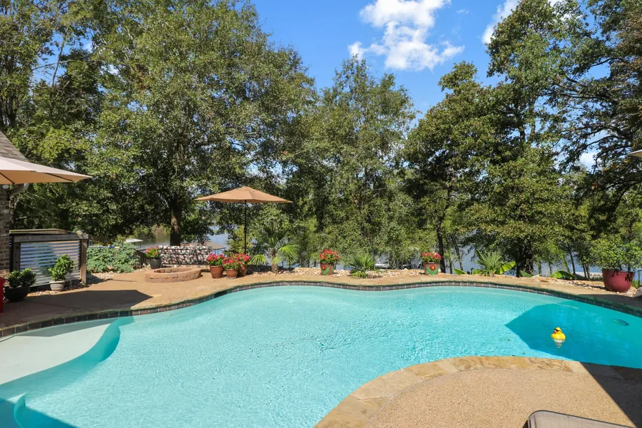 Imagine spending your days boating or fishing at the lake, enjoying the serene country setting from the deck, or relaxing in your pool!! This custom home with beautiful landscaping on Lake Palestine offers 3 or 4 bedrooms, an open living area with fireplace, a dream kitchen, a separate spectacular lake view living room with vaulted wood ceiling and soaring glass, and an approximate 800sq. ft. bonus room upstairs to meet your needs as a game room, 4th bedroom or crafts room. The kitchen is the heart of this home with gas cook top, stainless appliances, a very functional island, lots of storage with slide out drawers, wine refrigerator and wine rack along with a breakfast bar for family and friends that always migrate to where the food is! French doors in the den and kitchen/dining space allow easy access to the covered porch, deck. The primary suite is spacious, light filled and very functional with bedroom opening to the pool, porch and patio. The en-suite bath with fabulous spa shower & separate walk in closets---oh so well designed! Bedrooms are well sized, bright with large windows and generous closets. Upstairs the flex space can be utilized as a 4th bedroom/bunkroom/man cave or theatre room, perfect bonus space in a lake home. The laundry/mudroom holds more storage as well a second refrigerator. Outside, enjoy approximately 138' of serene waterfront with a floating boat house, (never worry about water levels!) though the water here is typically 5-7' deep with easy access to the main body of the lake. Enjoy the Gunite pool easily accessible from multiple rooms of the house--it's a wonderful place to entertain or just enjoy family time especially since it also has a misting system to keep pesky insects away! The three car garage holds a surprise--it's climate controlled and a hot tub is located here for year round use. This home offers something for everyone in your family! 20' Bennington pontoon boat, Kawasaki side by side 2023 JD mower included with sale!