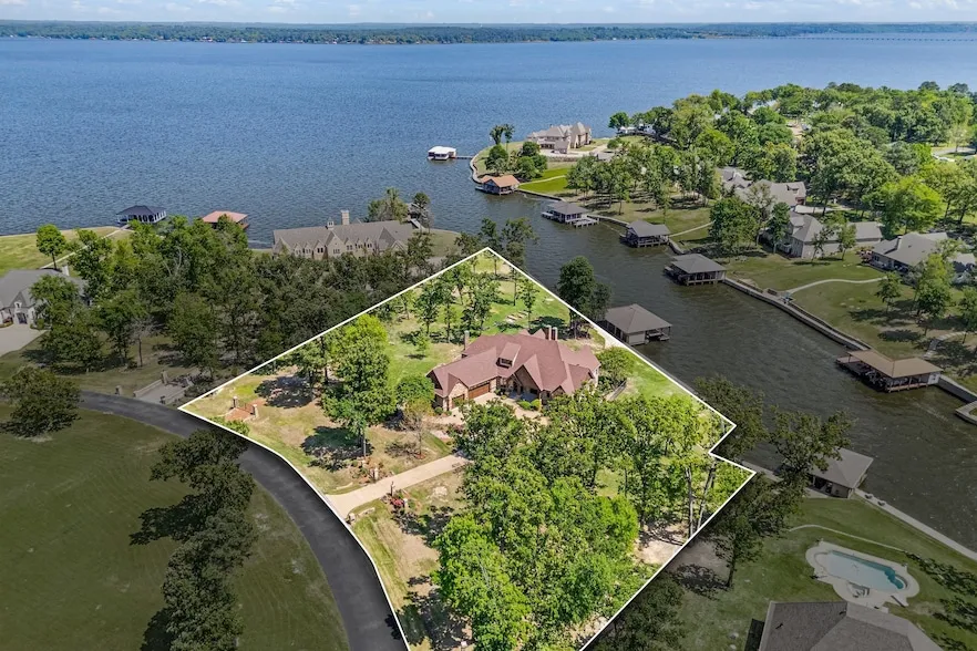 Discover Unparalleled Waterfront Retreat nestled on the tranquil shores of Lake Palestine in gated Brown's Landing. Spanning 2.1 acres of lush landscape & 442 feet of pristine shoreline featuring recently reinforced bulkhead. Step through grand entrance of the remarkable 5,738 sq. ft. home, you are greeted by expansive living area bathed in natural light, soaring vaulted ceilings & stunning fireplace. The seamless flow into formal dining rm & incredible gourmet kitchen, complete with oversized island, makes space perfect for entertaining. Imagine sipping your morning coffee on covered side patio with wood-burning fireplace while enjoying breathtaking lake sunrises. A versatile bonus rm, perfect for dining or relaxation, boasts captivating lake views. Retreat to the luxurious primary suite featuring expansive layout, elegantly appointed bathroom with coffee bar, generous closet, & private outdoor access to backyard. Venture downstairs to discover thoughtfully designed lower level that boasts add'l living area complete with cozy fireplace, game rm, pool table, bar, & state-of-the-art media rm featuring updated Full Swing golf simulator. This level also includes 3 additional bdrms, 2.5 baths, & tons of storage! Step outside on your lower patio into peaceful waterfront living. An innovative bug misting system encircles home & boathouse, allowing you to fully enjoy outdoor spaces seamlessly. 3-stall boathouse, featuring Garapa Brazilian hardwood deck & convenient storage area with overhead door, nestled in bay protected from wave action & strong winds offering easy access to fishing, boating, & skiing. This extraordinary property combines luxury, comfort, & functionality with features like newly upgraded Crestron home automation system, automated screens, Hickory wood flooring, Generac Whole House 36 KW backup generator, & 2 buried propane tanks 1,000 & 500 gallons. Potential flexibility in lot configuration, this estate represents a unique value in today s market.