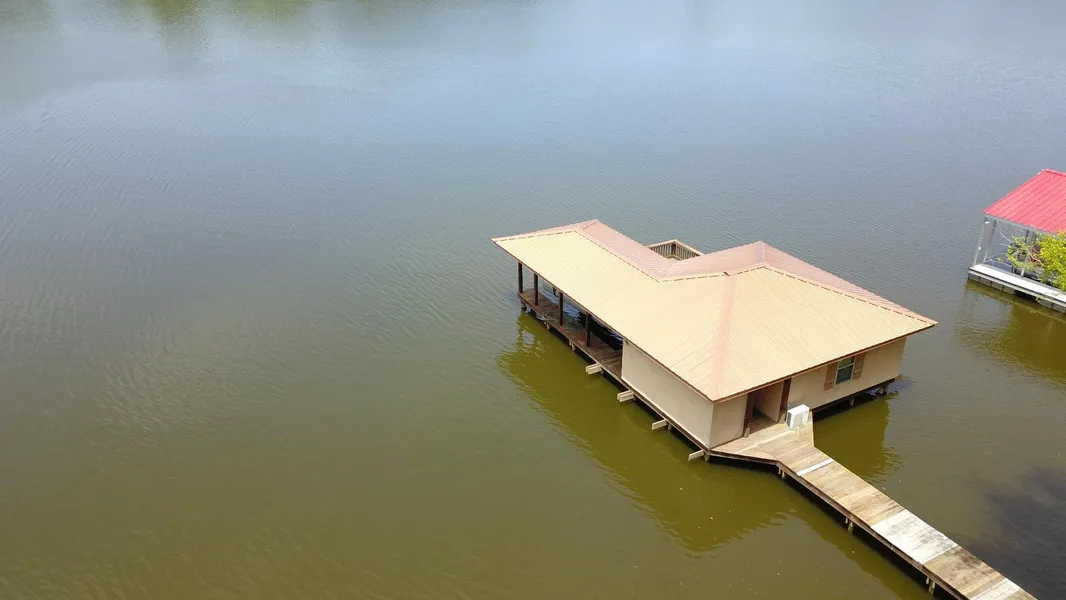 Prepare for pleasant surprises from the winding drive down the county roads under the amazing tree canopy to the secluded neighborhood of Water Ridge with beautiful waterfront homes. Half acre lot will Wow you with lovely mature trees & graceful slope to lake. Perfect lot for circular drive & single-story home. Stroll down to water & be welcomed to Casita Puesta del Sol! Spacious 18x27 party deck large enough to fish from, sunbathe or BBQ plus covered area! Electric lift, fish cleaning sink, bug misting system & closet. Inside you will find wood floors, paneled walls, French doors, kitchen w stove & mini fridge. Automatic underground sprinkler lake pump system. Water depth at boathouse is 7-8'.