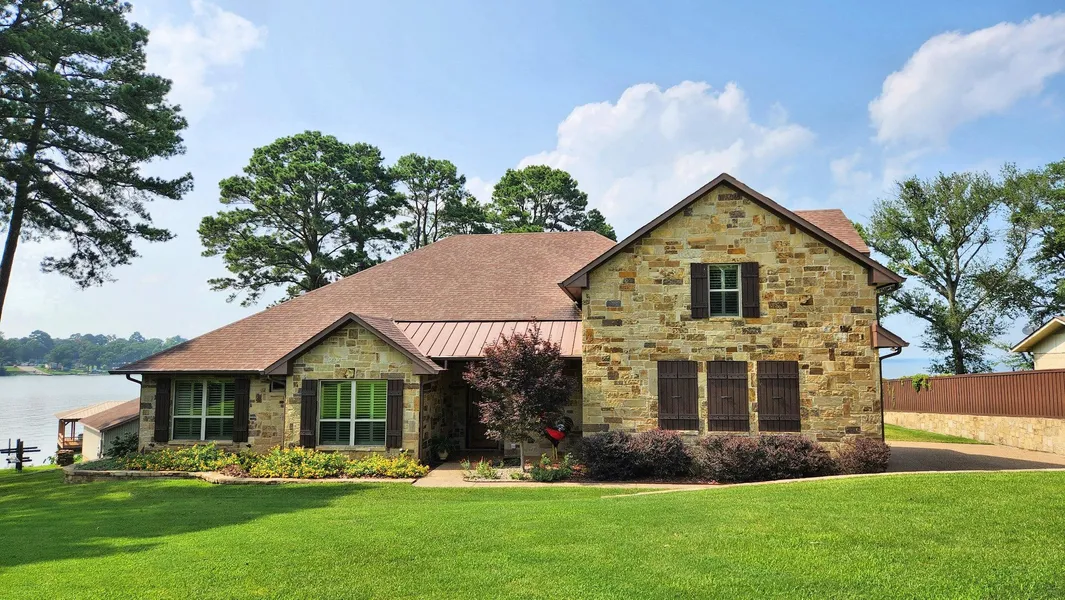 Exceptional Waterfront Home on Lake Palestine in the hills and trees of East Texas near Tyler! Custom built in 2016 with 3730 sq. ft., this 4 bedroom (plus upstairs Bonus Room), 3.5 bath home has it ALL! Back of home is covered with windows, showing the expansive open water views facing north across lake. Moonrises and sunrises can be seen from this vantage point! Large open living with vaulted beamed wood ceiling and Gas FP opens to dining/kitchen w/island & breakfast bar, supporting elegant & comfortable entertaining for large groups. Chef's Kitchen has stainless steel appliances including double dishwashers, double ovens, gas cooktop, and lots of storage! Exceptional knotty Alder cabinets & trim, 12' ceilings, & shutters accentuate the detailed beauty of this home. Upstairs bonus room w/ bath can be used as additional huge bedroom /bunk room or game room! Spacious sunroom with wood burning fireplace on main level has access to half bath. Primary bedroom is separated from guest rooms. 28' over-sized garage for larger vehicles and generous storage plus separate large shop for hobbies/storage is located at left side of back yard. Energy saving spray foam insulation, 2 a/c units w/ 5 climate controls, & 2 tankless water heaters provide efficiency for this amazing home. Stereo system in living/dining/kitchen & sunroom/2nd living area for your enjoyment. Stone terraced back yard and gas fire pit with lots of seating plus boathouse w/2 lifts and covered seating provides great space lakeside! Adjacent to beautiful bay offering comfortable and safe space for water activities with family and friends! Spider misting system on home & boathouse prevents webs from forming. And if that isn't enough, a putting green, adjacent to the patio, completes this AMAZING package!! Don't delay - the peaceful lake life awaits!