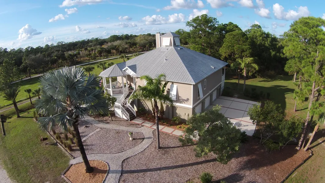 THE HURRICANE PROOF HOME! Natural light streams through the cupola and French doors of this architect designed and custom built Florida style home. The open floor plan, built by Richardson Homes, includes commercial upgrades, breathtaking views from large porches, a dream kitchen, and an Iso-Kern fireplace for warmth or wood-burning for beauty. The master suite opens to the screened back porch and spa, and provide a tree house view of sunrises. The ground floor includes a guest suite with kitchenette, full bath, safe room/hobby room, and storage closets plus parking for 3 vehicles. This 4 bedroom, 3 bath home is constructed of polysteel with solid concrete walls and includes commercial grade hollow core cement slab sub-floor. There is a 20 kw generator with automatic transfer switch, Bahama style hurricane shutters, and an alarm/video security system. A 3,000 square foot concrete slab is...