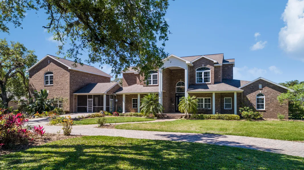 THE HALLMARK OF SUCCESS! A FLOOR PLAN TO FIT EVERYONE! This two story traditional brick custom designed beauty is in a class by itself. Over 4000 sq. ft. of living area (4 bed/2.5 bath + 1 full bath efficiency). Not one, not two, but three screened attached porches, including a huge lakeside lanai for entertaining family or friends. A 4 car garage is attached to main home by a 945 screened porch. Above the garage, there is an efficiency (game room), with a full kitchen and bath. Additionally, there is a 2nd 4 car detached garage with an auto lift and a 14 x 14 office. This 2+ acre lakeside home is spectacularly xeriscaped for low maintenance with a full yard irrigation system, a front semi-circle paver driveway and a second cement driveway to the two garages. Elegant front entry with brick pillars and distinctive wrought iron front entry gates. This home speaks stellar quality in volume!...