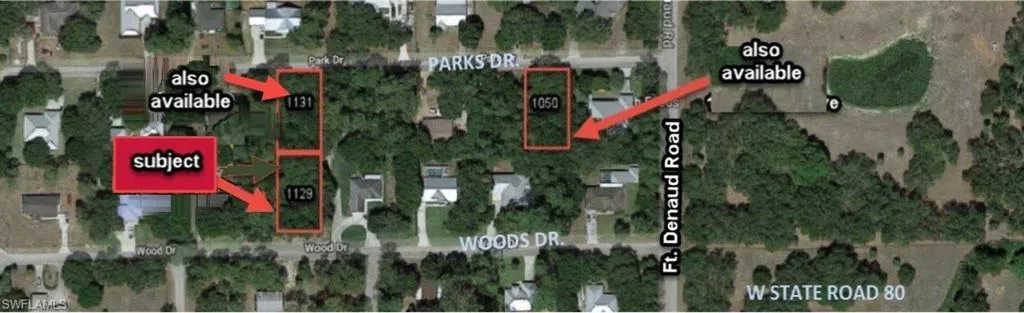 Research Parcel InformationFrom Hwy 80 eastbound, turn east (left) on Ft. Denaud Rd. Take first left (north) on Wood Drive. See sign. 2 additional lots available on the next street over (1059 & 1131 Park Drive).
