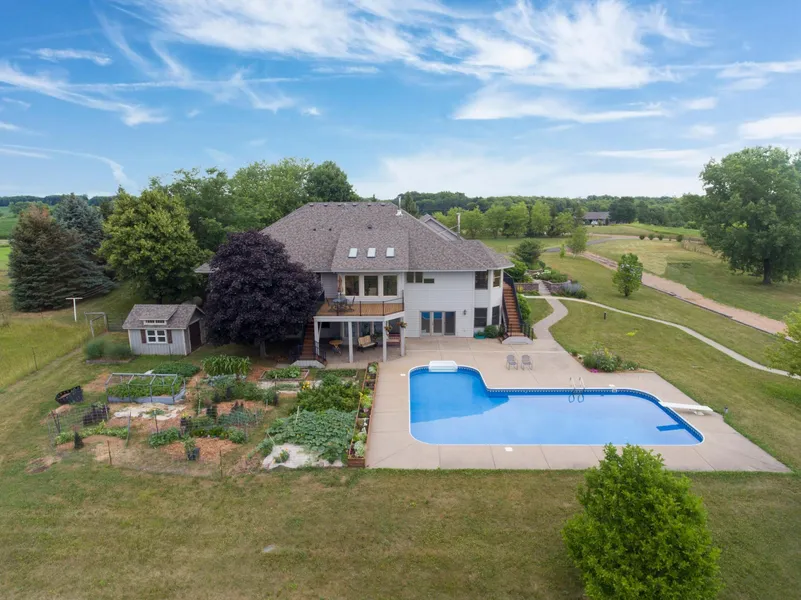 Spectacular 40 Acre organically managed farmstead 20 minutes from downtown Mpls. Pastures (8) for horses, cattle and goats. Multiple gardens plus small vineyard. Saltwater pool in picturesque setting. Thoughtfully designed open concept house (Kitchen/great room with high ceiling). Abundant natural light. Decks. Shop/utility bldg. (72x56) with 30x24 heated workshop, office and livestock stalls. Pole barn (45x30) in pasture for equipment, hay storage and animal shelter. Geothermal and lp heating/cooling system for house. Possibility for subdivision of land.