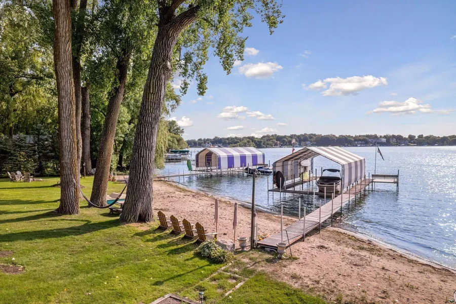 A rare "walk-in" south facing sandy beach on Lake Minnetonka. Enjoy sunsets from the spacious 52 x 16 deck. A perfect Lake Minnetonka retreat! The 5,703 sq ft lake home has room for everyone! The lakeside owner suite features a slider to the lakeside deck and also has a cozy fireplace. The large Guest en-suite is roomy enough to accommodate an extra bed (or can be easily divided into another bedroom). Be prepared to be "wowed" when you enter this stunning lake home's dramatic vaulted Great Room featuring awesome panoramic water views thru a floor to ceiling glass wall. The cozy lakeside den makes working from home a delight. Lots of room for lake toys in the lower level fourth garage of 750 square feet. There is a second driveway off of Rest Point Lane to access the roomy driveway. Remodel or Rebuild your "Dream Lake Minnetonka Home" on this FANTASTIC lake lot. Vacation on the lake everyday at home!!