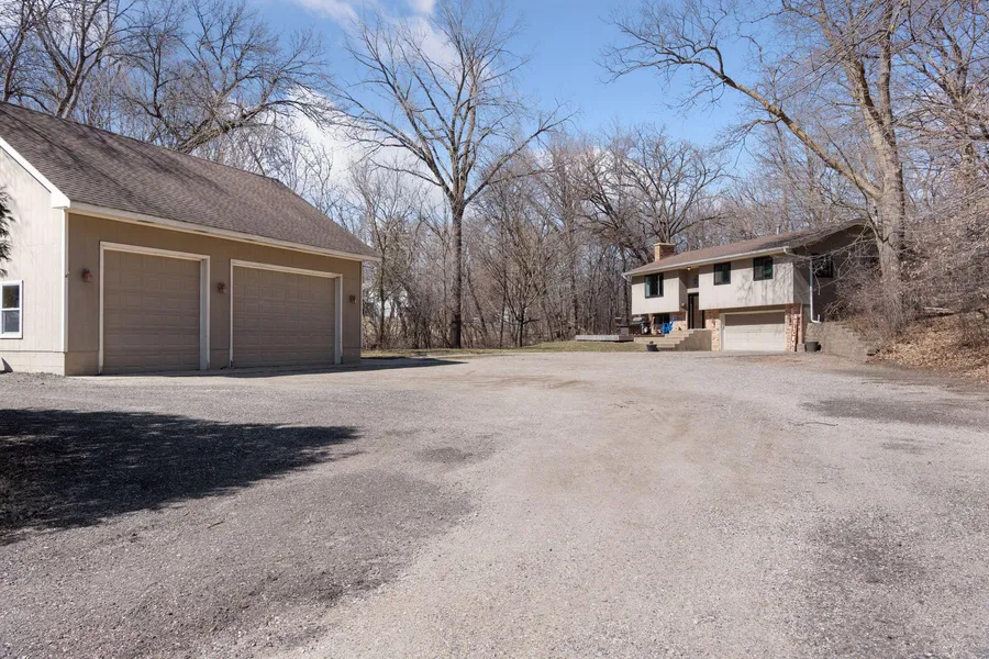 Nestled on a tranquil 1.79-acre lot, this charming home offers the perfect combination of seclusion and convenience. Featuring a recently built 3-car garage/workshop with over 1,000 sqft of space, it's ideal for hobbyists, car enthusiasts, or anyone in need of extra storage and workspace. The 4-bedroom, 2-bathroom home spans 1,739 sqft and includes a spacious 2-car garage. The main floor showcases a light and bright open-concept kitchen, dining, and family room area, perfect for both everyday living and entertaining. The private owner's suite features a bath, two additional bedrooms and a full bathroom complete the main level. Enjoy cozy fires in the stone fireplace or relax in the three season porch while taking in views of the surrounding wildlife. The lower level offers a large sitting room and an additional bedroom, providing extra space for relaxation or guests. Surrounded by serene woods, this home offers a peaceful retreat yet remains close to all the essentials for everyday living.