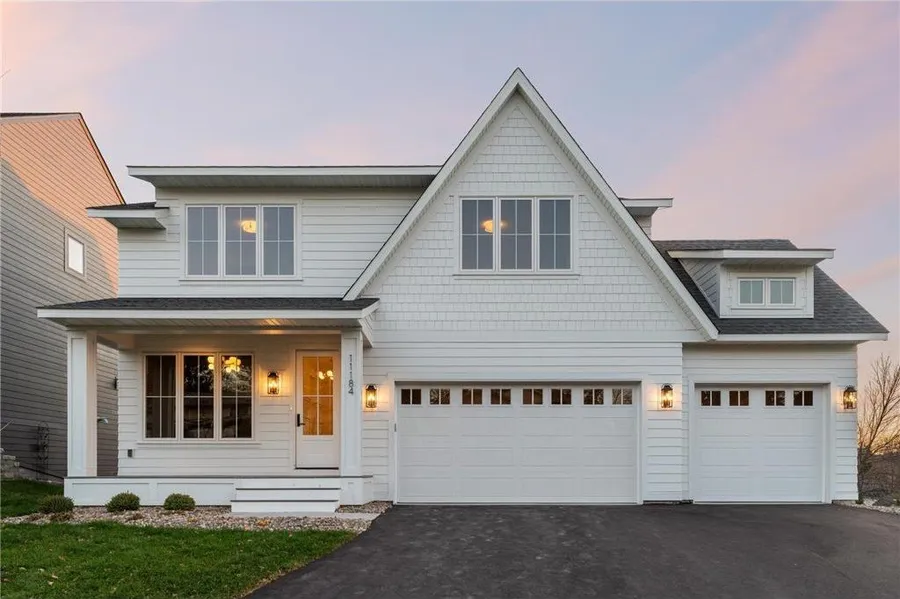 To-be-built two-story home in Hampton Hills with estimated completion Fall 2026. 3993 finished sq ft, 5 bedrooms, 5 baths, and attached 3-car garage on a 0.35-acre homesite, with buyer options for a 4-stall garage configuration. Neighborhood setting near Lake Pomerleau, the Hampton Hills greenbelt, park space, wetlands, and community trail system, with direct connection to the Northwest Greenway in Plymouth. Gourmet kitchen features custom cabinetry, wood flooring, oversized center island, walk-in pantry, wall ovens, ENERGY STAR stainless appliance package, and Fisher & Paykel professional appliances, opening to informal dining and great room with gas fireplace; main-level sunroom, office/study, and mudroom drop zone add flexibility. Upper level includes a spacious primary suite with luxury bath and freestanding tub, plus additional bedrooms with shared and en-suite bath layouts and upper-level laundry. Finished lower level offers media/rec room, wet bar, exercise/flex space, additional bedroom and bath, and storage, with customization options such as a golf simulator or sport court. Ask about available ADU layouts, plan alternates, and finish selections from builder portfolio. Zoned forced-air heating and central air, air-to-air exchanger, humidifier, drain-tiled basement with sump pump, 200+ amp electrical service, natural gas, city water/sewer, fiber-cement and shake exterior, asphalt pitched roof and sod included. Request details on available 3D walkthrough, video tour, and additional plan options.