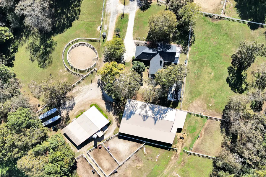 If you're looking for a horse property that has it all, you've found it with these thirteen-plus acres in Stockbridge. A long driveway takes you past open pasture and two different arenas before taking you to the stunning ranch home. Highlights in the home include a very spacious master bedroom with a spiral staircase up to loft space, a cozy family room, and a spacious country kitchen. To the side of the house sits more pasture and a round pen. Directly behind the house, there is a heated and airconditioned dog condo with pens and a powder room. As you continue towards the back of the property, you'll find a large indoor arena with 14 permanent stalls, two portable stalls, a tack room, and a bathroom. That's flanked by a smaller barn with 14 stalls with two tack rooms. There are also paddocks, a horse hot walker, and really everything you need to operate your very own horse farm. The property even has approximately an acre of forested land with a creek running through. If you've been looking for a property on which you can truly realize your equestrian dreams, you've found it right here, less than 40 minutes from Hartsfield-Jackson Atlanta International Airport.