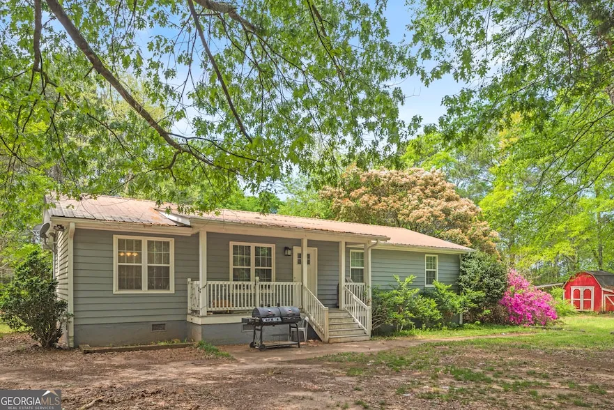 Ranch home on a private oasis! Set back on a level 6-acre lot, this home offers privacy and tranquility from the world around you. From the charming front porch, you enter the home into a large family room that opens up to a separate dining space. The kitchen has been recently renovated with wood block countertops and tile backsplash, and connects to a separate laundry room. The ample owners suite boasts an ensuite bathroom, and french doors that open up to the private and peaceful back deck. Two additional bedrooms and another full bath round out this functional and cozy floor plan. Windows were recently replaced, and the newer metal roof will ensure comfort for years to come. The home is on public water and there is also a well with a recently updated pump. A quaint red, farmhouse-style shed provides additional storage and covered parking. The back lot is mostly cleared and is ready to be made into the property of your dreams. The property features ample parking for a RV, boat, truck, you name it. Come see and make it yours!