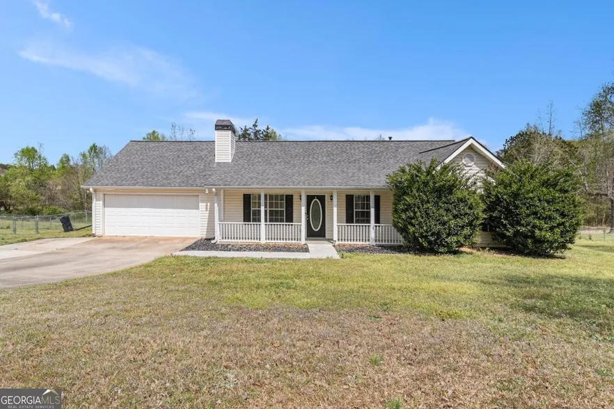 Discover your own private retreat with this beautifully maintained home nestled on nearly two acres of land. This charming home features a two-car garage, a fully fenced backyard, and a classic white picket fence framing the covered front porch. Step inside to an oversized living room with vaulted ceilings and a cozy fireplace, perfect for relaxing or entertaining. The chef-inspired kitchen comes with state-of-the-art appliances, a built-in island, and a full eat-in area ideal for gatherings. Down the hall, you'll find the private bedrooms wing. Outside, enjoy a fully fenced, private backyard, perfect for pets, play, or peaceful outdoor living. Whether you're hosting a barbecue, gardening, or simply enjoying nature, this backyard is a rare find.