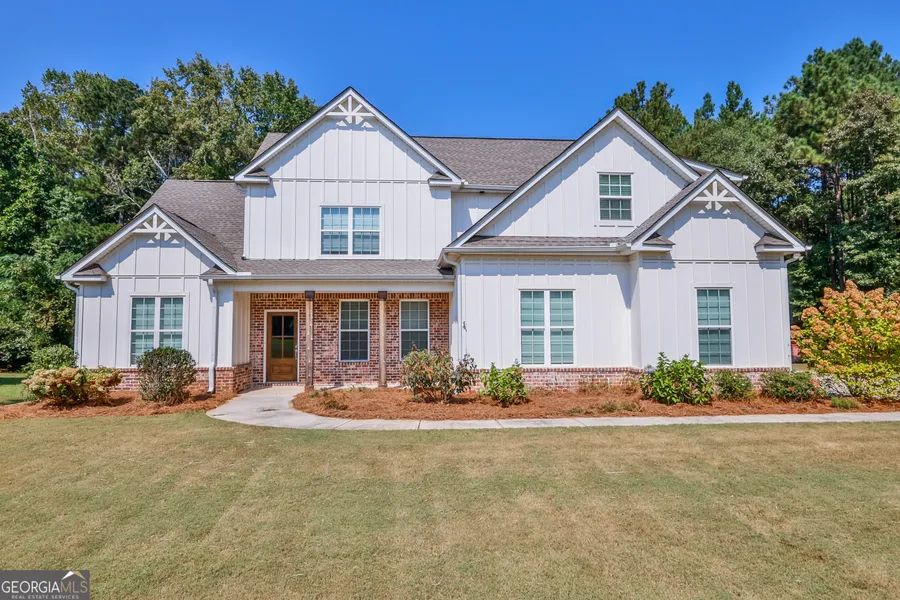 Custom-built in 2020, this Craftsman-style home sits on 3 acres with no HOA and a long, tree-lined concrete driveway. Inside, the open floor plan features LVP floors, granite countertops, a farmhouse sink, wall oven, modern cooktop with hood, and a large walk-in pantry, accented by shiplap details and barn doors. The owner's suite is on the main level with vaulted ceilings, a walk-in closet, and a stylish tiled bath, while upstairs offers four oversized bedrooms, two full baths, and a central loft-style sitting area ideal for an office or lounge. Additional highlights include two hot water heaters, walk-in closets throughout, upgraded finishes in every room, and outdoor living with a covered front porch, back patio, and plenty of space for business or recreation.