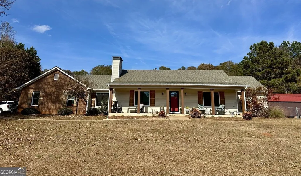 NEW LISTING!! This is a very well maintained 3 bedroom, 2 bath RANCH HOME plus a large BONUS ROOM / OFFICE (all one level, not upstairs). It's perfectly situated on 1.28 acres in the sought after Timber Ridge Elementary, Union Grove Middle and High School District. NO SUBDIVSION AND NO HOA! This ranch home has so many wonderful updates making it move in ready! As you enter the inviting rocking chair front porch, the large family room with a vaulted ceiling and hardwood floors makes you feel right at home. Get cozy and stay warm by the gas log fireplace this Winter. Recent updates include most all WINDOWS have been replaced with NEW high quality slide style windows, NEW HVAC in 2024, hardwood floors in the family room, luxury vinyl tile floors, ceramic tile in the bathrooms and mud room, the kitchen has granite countertops, new light fixtures, a new high end faucet, and newer Stainless Steel appliances, and new custom made font porch shutters and support post. The Primary bathroom includes an updated vanity with granite countertop, recently replaced exterior doors, some new light fixtures and ceiling fans - even two new fans inside the garage! The spacious mud room has a custom built-in hall tree with bench seating. The kids and pets will be safe having fun playing in the FENCED in back yard. After a long day at work, you'll enjoy relaxing outside on the patio overlooking a large back yard with mature Hydrangea shrubs, Japanese Maple trees and beautiful iris & lilies that will surprise you with gorgeous blooms next Spring! There is also a large outbuilding / man cave that's only two years old from Georgia Yard Barns that includes power and loft storage on both ends. There are so many great features in this home! The location is perfect and so close to interstate travel for shopping, restaurants or doctors visits. There are wonderful neighbors nearby, the area is quiet & peaceful and remember, NO HOA! Professional photos & video are coming soon.