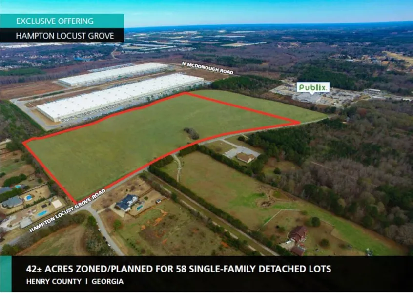 The property on Hampton Locust Grove Road is 42+/- acres planned for 58 single-family detached lots. It is less than 4 miles from I-75, offering convenient access via the Bill Gardner Pkwy interchange. The site is level and cleared.