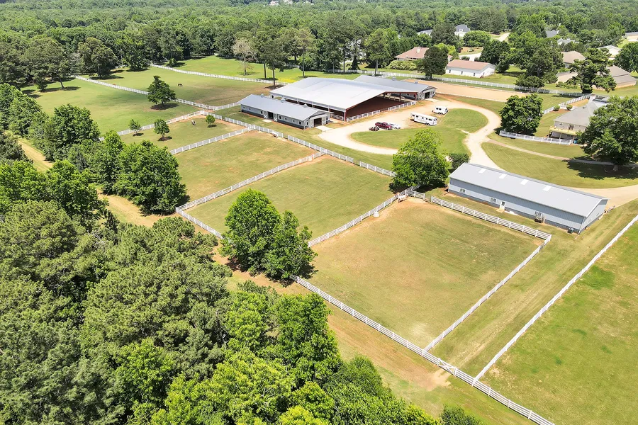 Welcome to High Flight Farm, a turnkey equestrian facility nestled in the middle of a unique community which has an airstrip. You'll find a wealth of equestrian features offering everything imaginable. The three custom Morton barns have a total of 28 matted stalls and each 12' X 12' (11) or 12' x 16' (17) stall is complete with built in hay mangers, Nelson automatic waterers on consumption meters, box fans, and stall windows protected from weather by an overhanging porch. All barns are insulated (walls and ceilings), have automatic fly spray systems, multiple tack rooms, wash stalls with hot and cold water, laundry rooms, lounges, feed rooms, full or half baths, and storage rooms. All rooms are heated and cooled. Riding arenas include a massive 120' X 120' covered arena, a lighted jumping arena that is 150' X 250', and a regulation size 20 m X 60 m dressage ring. Your horses will also en...