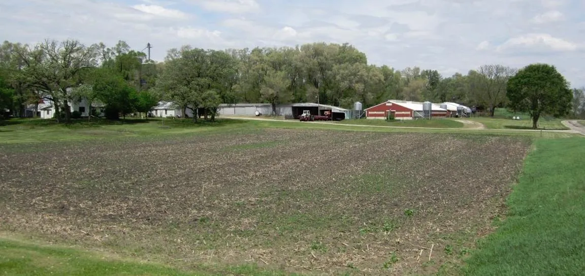 Property has a house and barns with attached sheds. Also 30' x 80' poured concrete silo with perforated floor and 15hp fan; 20' x 70' Harvestore with grain system with 15hp 3-phase fan; machine sheds, crib, hog confinement buildings and a hangar.