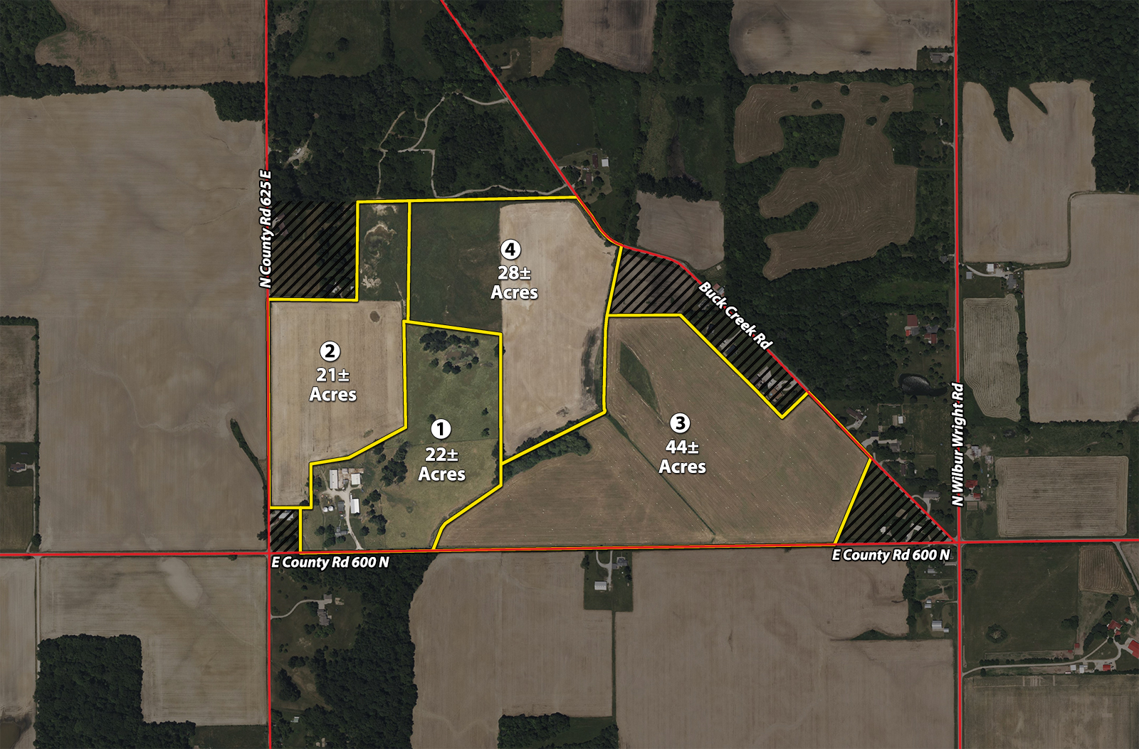 Tract 2: 21± ac with 18+/- FSA cropland Acres. Ample frontage along N CR 625 E. Add this to your operation or consider combining with Tract 1 or Tract 4. Potential Estate sized building Tract.