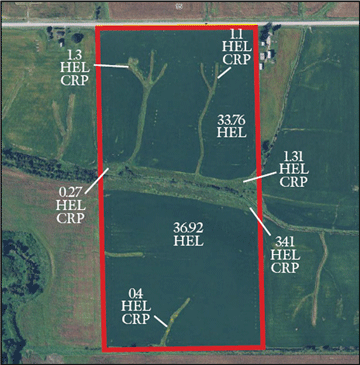 FSA information: 78.5 Acres tillable of which 5 acres is in CRP at $149.24 per acre, expires 9-30-16 & 2.4 acres is in CRP at $133.61 per acre, expires 9-30-12.