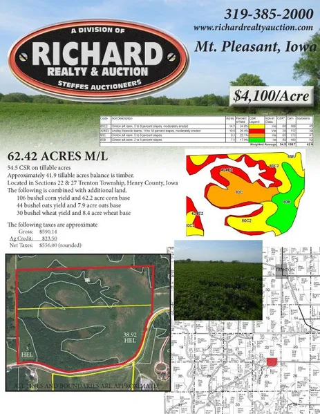 62.42 Acres M/L with a 41.9 Acres tillable balance being timber!!