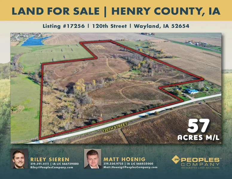Peoples Company is pleased to present 57 acres m/l located just south of Wayland, IA. This property is a recreational paradise consisting of 45.01 acres m/l enrolled into CRP with an annual payment of $8,372. Containing a mix of native grasses, timber thickets, and a pond allows abundant wildlife to use this property as a travel corridor, including whitetail deer, turkey, and pheasants. Whether you are looking for that perfect place to call home, a secluded weekend getaway, or a year-round recreational property, this may be the one that you've been searching for. The Henry County FSA 156EZ states that this farm consists of 46.72 cropland acres carrying a CSR2 rating of 63.2. The north 18 acres of the farm carry a CSR2 rating of 78 containing great soil types. The farm is located just south of Wayland, IA in Section 10 of Jefferson Township, Henry County, IA.
