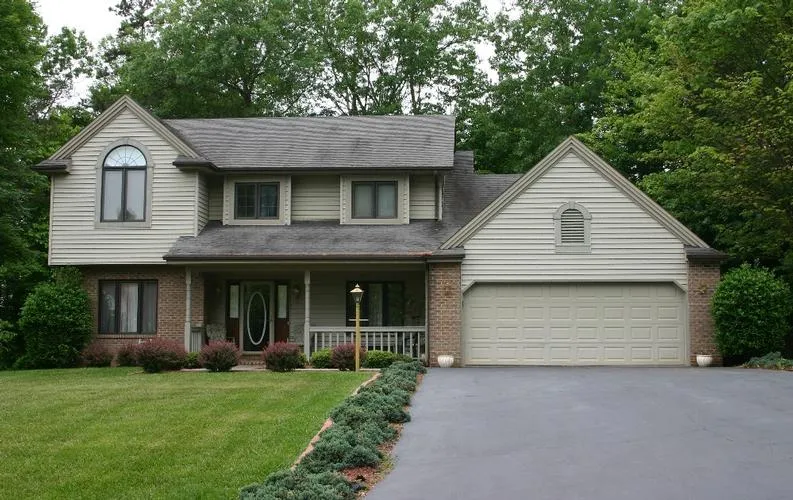 the landscaping has matured beautifully, with ground cover along the doublewide asphalt driveway.