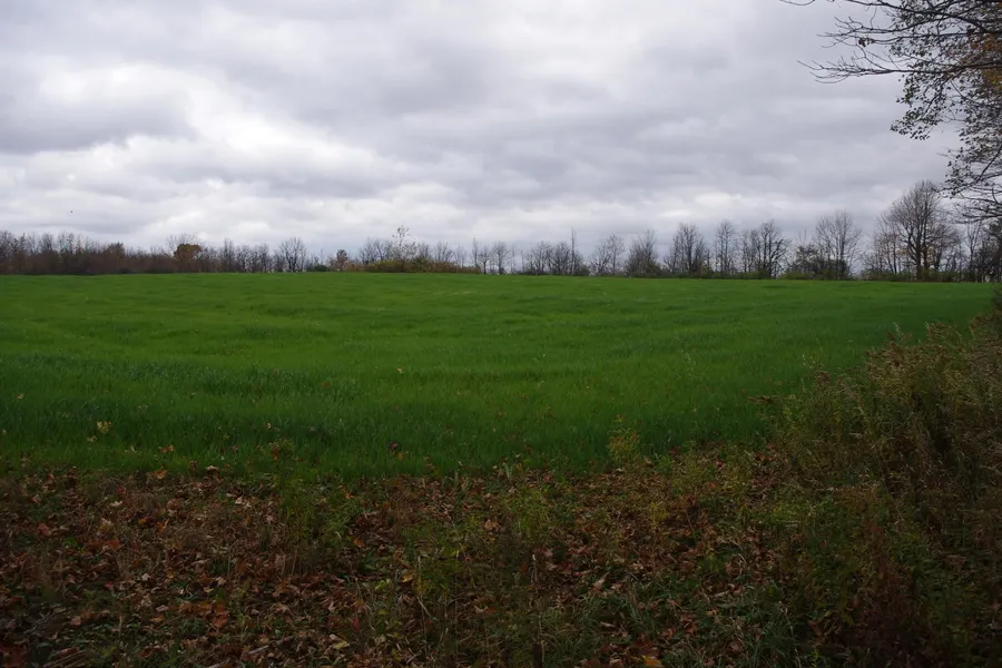 This 89.5 acres is mostly open and mostly planted in soybeans and rye. Big broad nearly level fields combined with high lime soils make it an impressive piece of land when you see it. The east end has thin soils as evidenced by bedrock exposed by some sort of minor quarrying and is not considered tillable. This area is brushy or lightly wooded. Elsewhere there are only woods where the terrain briefly gets steep - most trees there are Sugar Maples. There are a few acres that are tillable yet are not used by the tenant - my estimate is that someone could crop up to 70-75 acres here.