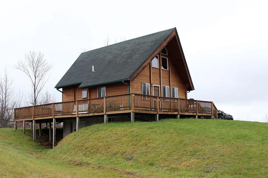 Beautiful Cedar Chalet on 6.6 acres. 2BRs, 1 bath, kitchen with breakfast bar, cozy lvr with wood stove, nice open floor plan, rustic Adirondack decor, awesome wrap-around deck. Bsmt has overhead door great for storing your toys. Stream in the back. Here's one you can enjoy!