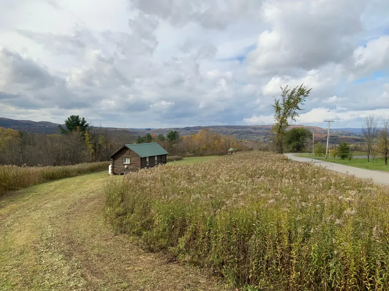 75 acres in Danube, NY, Herkimer County with a small log cabin 12 x24 including front porch makes for a comfortable stay for hunting season. Terrific access along year-round, gravel road leading onto an elevated plateau overlooking 30 miles of hillsides...views are awesome! Walk right out the door of your camp and into your 75 acres of woodlands to hunt whitetail, bear, turkey, and grouse. Mixed habitat of apple thickets, hardwood ridges, softwoods, several creeks, and small meadows and bedding thickets. Really nice trails run through the property leading to several different hunting locations.