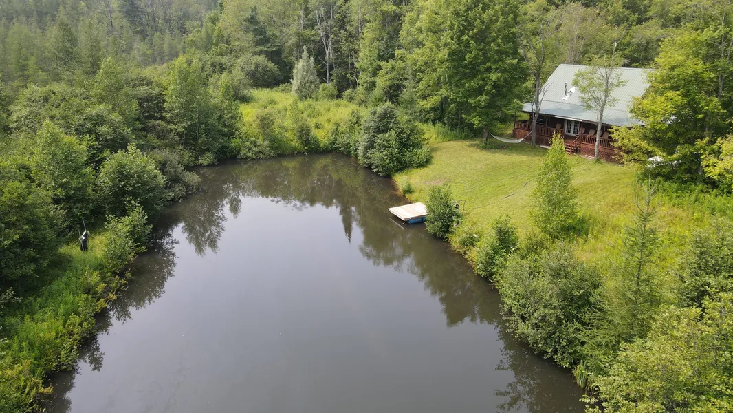 Authentic 24 X 34 log cabin finished in 2010, completely self-sufficient off the grid with solar panels, a generator backup, and propane lighting, refrigerator, and oven in your stocked kitchen. Relax on your covered porch overlooking your own private, spring-fed pond with a dock perfect for swimming and fishing, stocked with bass, perch, and catfish, along with the tranquil sounds of frogs. This Adirondack log cabin has an open floor plan with a large kitchen, 1 bedroom with a large loft, and a full bathroom with hot and cold water. Complete with a standard septic system and a 225-gallon water tank that is pumped with water from your spring-fed pond, which has been tested and is potable water. Total privacy best describes your own Adirondack Cabin nestled in the middle of 49.9 acres wi...