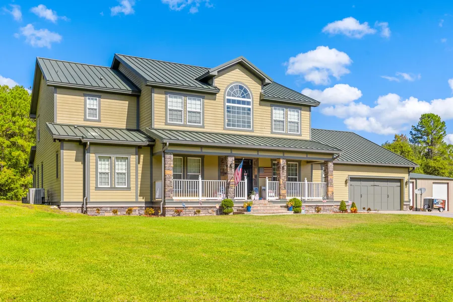 Welcome to your home in the country. Gated community with paved road to your front porch. Gorgeous two story home with front porch. Top finishes inside and out on this home overlooking 9.6 acres. For less maintenance this home is built with cement blocks and hardy board siding, and a seam metal roof. The front covered porch leads into a 2 story foyer with stairs leading upward. The second bedroom is to your left for guests or an office. To the right is the formal dining room. Continue forward in to the two story high great room with a large stone fireplace and French doors opening onto the back covered porch. To the left is the master bedroom with two walk in closets. The master bath has split vanities and a water closet with private toilet. There is a separate walk in shower and a beautiful raised bath tub. The great room opens to the dinette and kitchen area that has a breakfast bar and island for preparation. Stainless steel appliances including a dishwasher, cooktop, and double ovens compliment the area. The wood cabinets have the soft close drawers. Granite countertops are in the kitchen, bathrooms, and laundry. The hall leads to a closet pantry and laundry room. Here you have two countertop areas to fold clothes and a hanging area for more clothes. There are also plenty of cabinets for storage. This area also has a 14x12 bonus room with no windows but has a closet. You choose how to use it. It could be a media room , office, storage, exercise area or whatever you choice! Next is a full bath with walk in shower that has a back door for access from the pool area. The upstairs has four bedrooms all with walk in closets and shelving. The upstairs bath has three sinks in the vanity and a water closet with a separate shower and tub, plus a separate walk in shower and an additional water closet with the toilet. The walkway has a beautiful overlook of the great room. The rear covered porch provides a great location for entertaining. Pavers lead to the zero depth pool and spa. PLUS there is more outside. There is a 5000 sq. ft. metal building with three bays and a full bath. AND if you build it they will come! You have your own lighted baseball field with a batting cage in the metal builidng. What more could there be? There are paths through your woods to walk and enjoy nature or ride your ATV. But even more important is the access to private Lake Hancock to catch large bass. There is no public access to this lake. Do not miss out on this dream property. Call for an appointment now. Irrigation system added and new flooring was put in 2020.