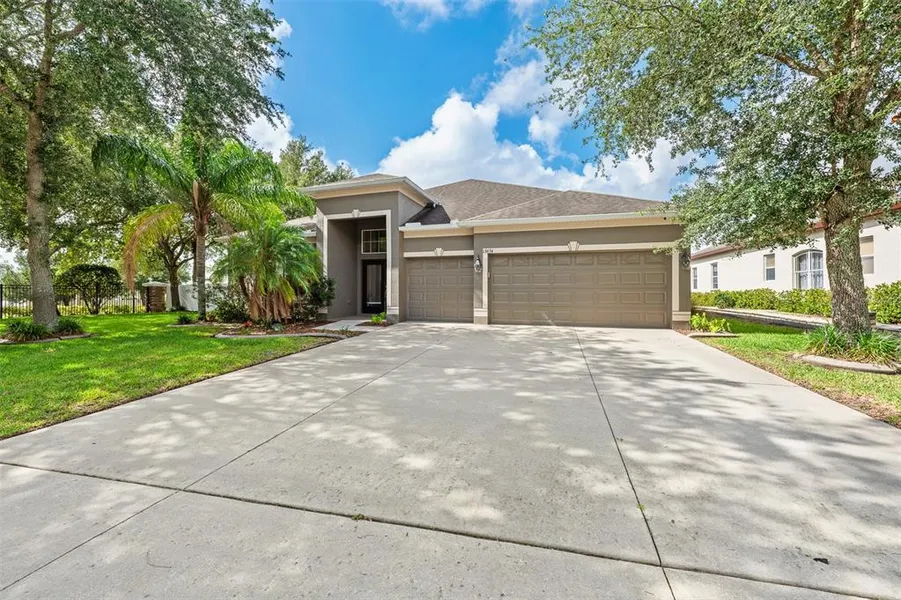 Under contract-accepting backup offers. One or more photo(s) has been virtually staged. *Now OFFERING a 1% INTEREST RATE REDUCTION for the first 12 months at no cost to the buyer when using preferred lender - saving thousands!* This one story, 5 Bedroom, 3 Bath home at Somerton Place at the Villages of Avalon has a flexible floor plan with 2,675 square feet of living space. A bright, spacious foyer with double door entry leads to the living room and dining room. The family room sliders lead to the covered, screened lanai overlooking a fenced and manicured backyard. The kitchen features granite counters, a closet pantry, breakfast bar, black stainless steel appliances and a dining area. The primary bedroom suite also has sliders to the lanai and has an en-suite bathroom with dual-sink vanity, a separate tub and shower, and a large walk-in closet. This triple split floorplan home has three secondary bedrooms with two additional full bathrooms, and the office can also serve as a possible 5th bedroom. The home features an alarm system, cameras and yard sprinkler system. Easy proximity to shopping and highway access! Community amenities include a dog park, community pool and fitness center - along with low HOA fees! Call today for your private showing!