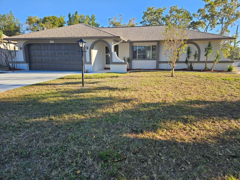 Stunning Three bedroom and Two Bath home sits on more than 1/4 acre corner lot. The home features a new hot water, new air conditioning and is beautifully and freshly painted inside and out. There is new upgraded laminate flooring throughout most of the home. The kitchen and baths have been totally re-imagined. There is also a bonus room under air and a large lanai with a Huge Hot Tub to relax and enjoy. The enormous back yard is fully fenced and there is a storage shed for decorations, tools and toys. The eat-in kitchen has brand new appliances and opens to the large dining room. The most finicky buyer will fall in love with this home! Hurry in!